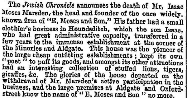 My great-great-grandfather Isaac Moses (1808 - 1884) was the son of Elias Moses, and the “Son” in the firm of E. Moses & Son. Everything about E. Moses & Son I have put on the Elias Moses page. In 1865 Isaac adopted the additional surname Marsden, as did the entire family.