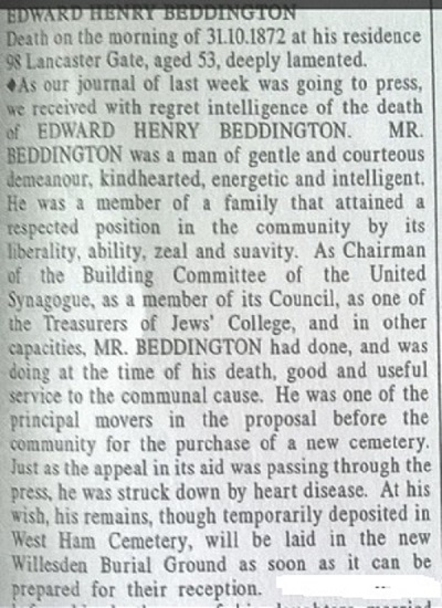 1872 Edward Henry Beddington (formerly Moses), husband of Julia (Isaac’s first child with Rachel), dies aged 53; his death is reported in the Jewish Chronicle (Doreen Berger, “The Jewish Victorian 1871-1880”):