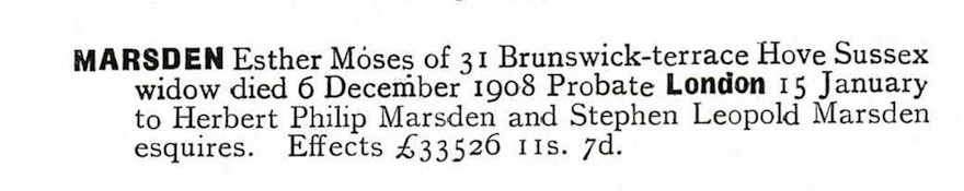 - Miss Hilda Ethel Marsden (1874 - 1964). Hilda’s probate was £32,725; one of her executors, Richard Reuben Arbib, Company Director, was her nephew (son of her sister Dora), the other was Elizabeth Annette Lee (daughter of her sister Effie Solomon).