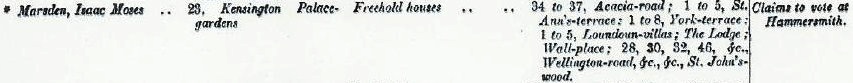 1868 Elias Moses, father of Isaac Moses Marsden, dies on 24th January at 57 Porchester Terrace, Bayswater. He is buried at West Ham cemetery, Section PM, Row 6, Plot 23. His will is proved by three of his executors, and all are his sons-in-law: Barnet Joseph (married to Fanny), David Hyam (married to Hannah), and Meyer Meyer (married to Sarah). The Josephs now live in Brighton, the Hyams at Colville Square, Notting Hill, and the Meyers at 53 Gordon Square.