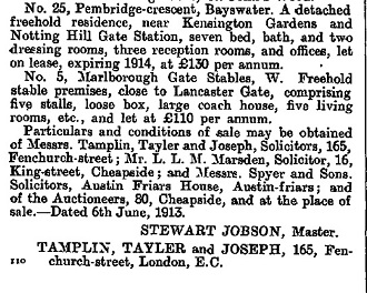 Now at the height of his success, Isaac Marsden and family move to 23 Kensington Palace Gardens. “The first occupant was Isaac Moses, a merchant, who bought the lease … towards the end of 1855….. In 1856 the same architect [J. D. Hopkins] designed for Moses the two-bay three-storey extension at the south-west corner and the bow-fronted ballroom at the back. The elegant conservatory on the south side was erected in 1877–8 to the design of Edward Salomons, who was also the architect of a new billiard-room which was built at the north-west corner in the same year. This house is now (1972) occupied by the Japanese Embassy.”