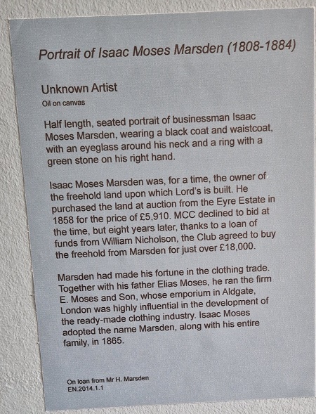Portrait of Isaac Marsden at Lords Cricket Ground, St John’s Wood, London. After being repaired it was rehung in the Committee Room in July 2025. Photos by Hugh Marsden, owner of the portrait (son of Cedric Herbert Marsden and grandson of Herbert Philip).