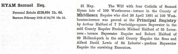 1871 The eldest son of Lawrence Hyam, Hyman Hyam, is now aged 32 and lives at 46 Leamington Road Villas, Paddington, with his wife Hanna (born 1846 in Hamburg, Germany). They have two daughters: Caroline, born 1868 and named after her grandmother who died in 1845 when Hyman was aged 6), and Bertha (1870).