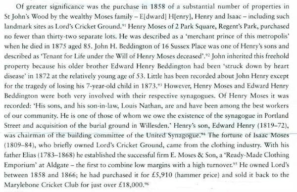 1858 The “great auction” of property in St John’s Wood is spread over five days. A large number of properties are bought by Isaac, his son-in-law Edward Henry Moses (who had married Julia in 1849, and would later use the name Beddington), and Edward’s father Henry Tsebi Moses. Isaac purchases from the Eyre Estate the site of the Marylebone Cricket Club (MCC), which he would sell to the MCC in 1866 for triple the price. Mireille Galinou has written a detailed account in her book on St Johns Wood, “Cottages and Villas: The Birth of the Garden Suburb” which was published in 2010. Here is an extract: