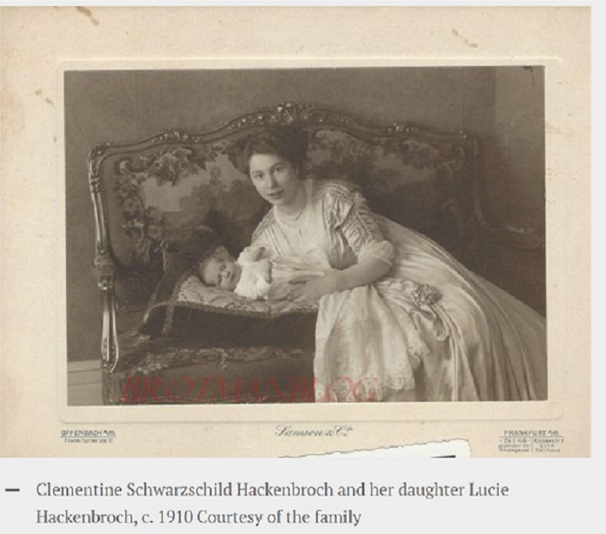 The daughter of Alfred Isaac Schwarzschild and Recha Goldschmidt, Clementine, was born in Frankfurt in 1888 and married Zecharias Max Hackenbroch, who like her grandfather Selig Meier Goldschmidt was an art dealer; he was born in Frankfurt in 1884 and died there in 1937 aged 53. Clementine Hackenbroch moved to London with her three daughters: Lucie Ruth (born 1910), Yvonne Alix (1912), and Irene (born 1918).